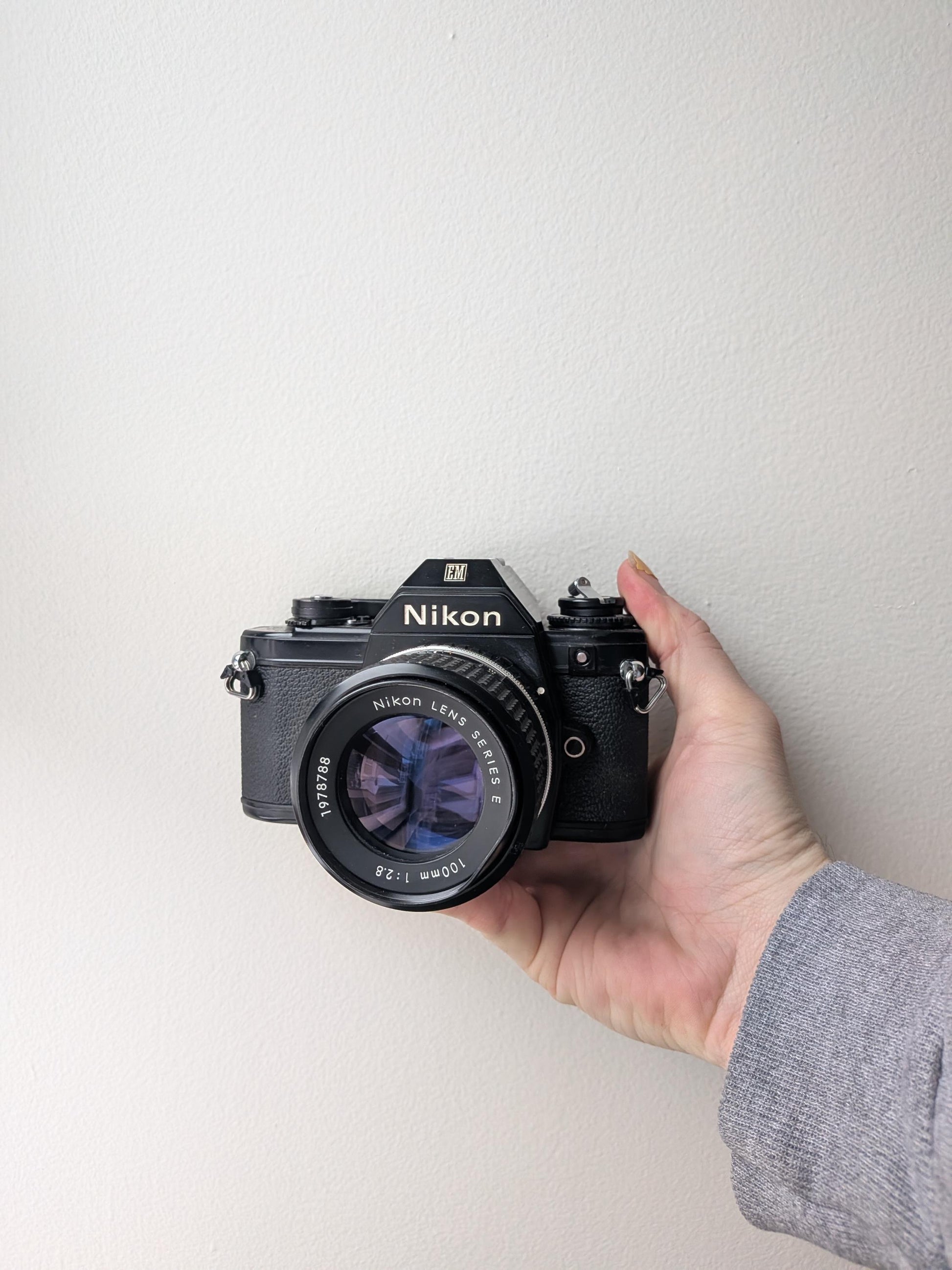The Nikon EM is a compact and lightweight 35mm SLR that pairs classic Nikon build quality with simple, approachable operation. Designed as an aperture priority camera, it is easy to use while still delivering excellent results. This listing includes the Nikon Series E 100mm lens, a sharp and well regarded lens known for its clean rendering and pleasing compression.